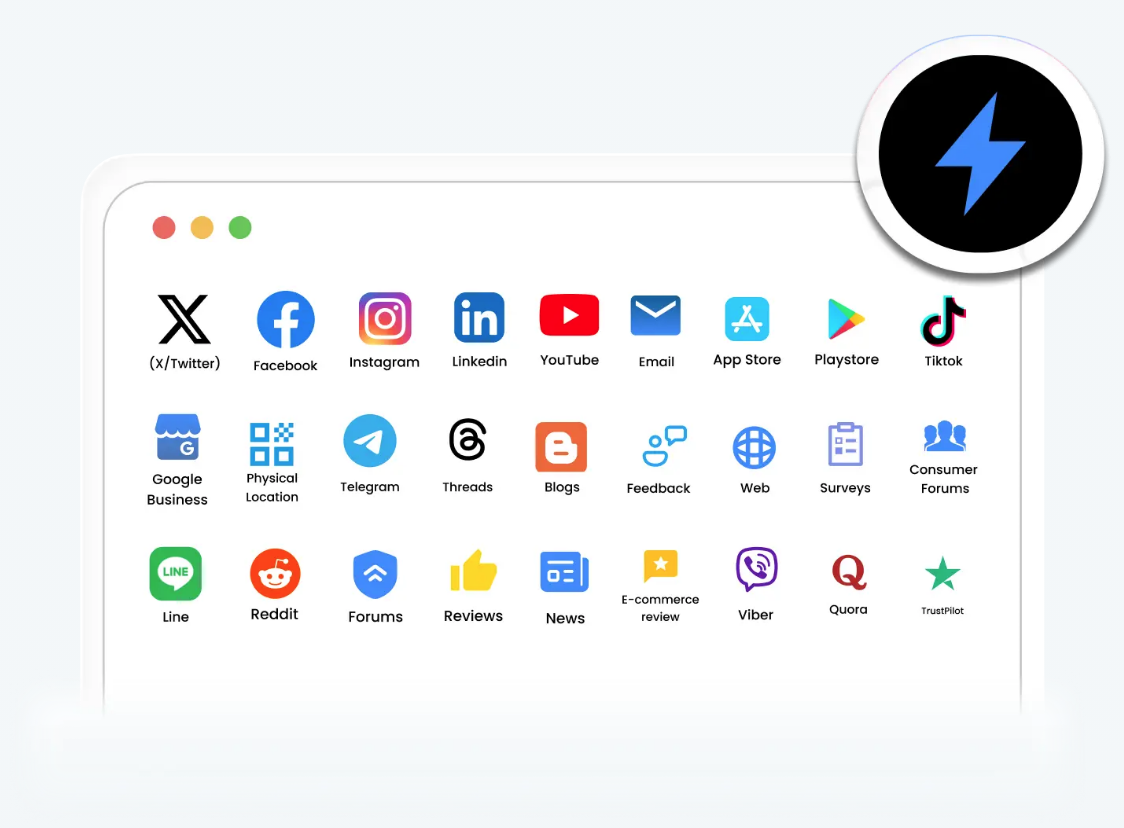 Social Listening & Web Monitoring: Real-time tracking of brand mentions, keywords, and industry trends across millions of online sources, including social media, news, forums, and offline data integration.